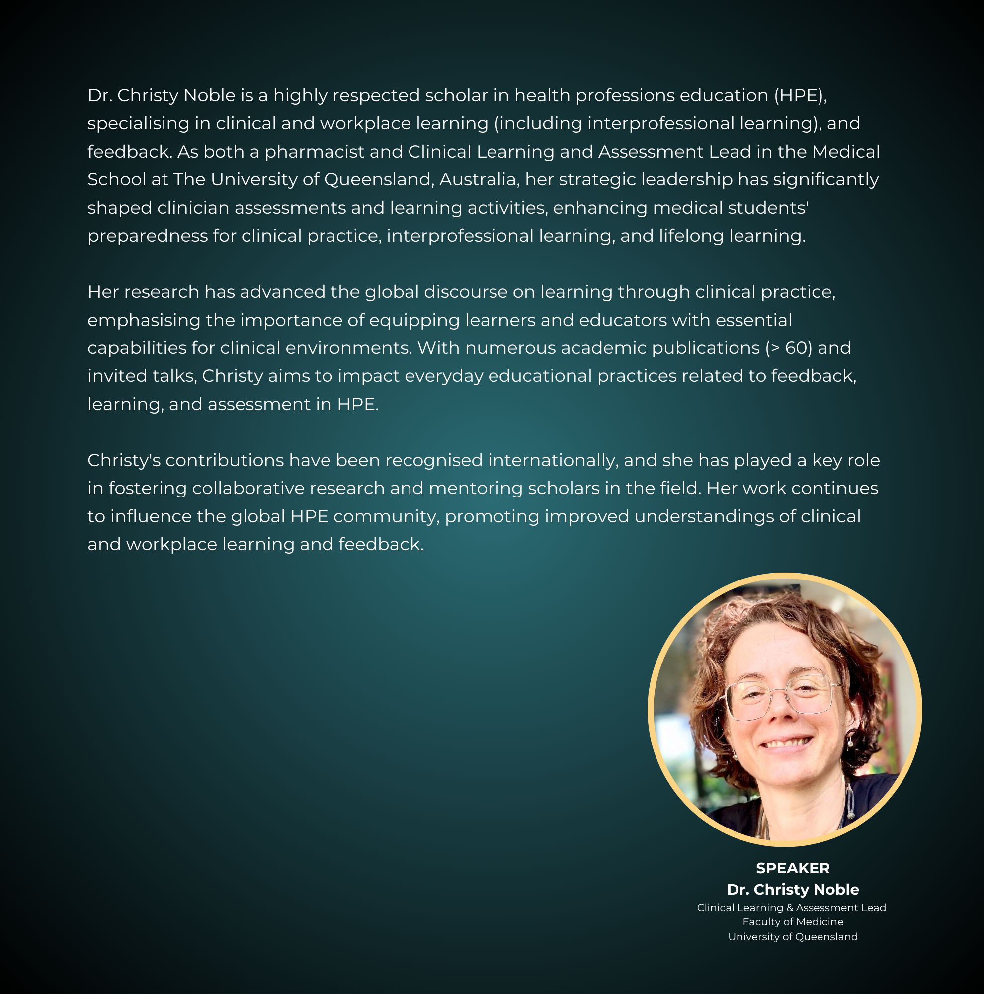 Dr. Christy Noble is a highly respected scholar in health professions education (HPE), specialising in clinical and workplace learning (including interprofessional learning), and feedback. As both a pharmacist and Clinical Learning and Assessment Lead in the Medical School at The University of Queensland, Australia, her strategic leadership has significantly shaped clinician assessments and learning activities, enhancing medical students’ preparedness for clinical practice, interprofessional learning, and lifelong learning.