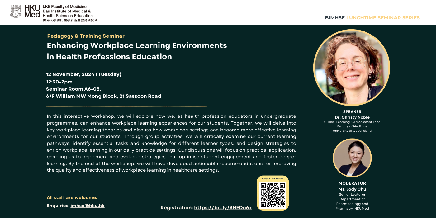 In this interactive workshop, we will explore how we, as health profession educators in undergraduate programmes, can enhance workplace learning experiences for our students. Together, we will delve into key workplace learning theories and discuss how workplace settings can become more effective learning environments for our students. Through group activities, we will critically examine our current learning pathways, identify essential tasks and knowledge for different learner types, and design strategies to enrich workplace learning in our daily practice settings. Our discussions will focus on practical application, enabling us to implement and evaluate strategies that optimise student engagement and foster deeper learning. By the end of the workshop, we will have developed actionable recommendations for improving the quality and effectiveness of workplace learning in healthcare settings.