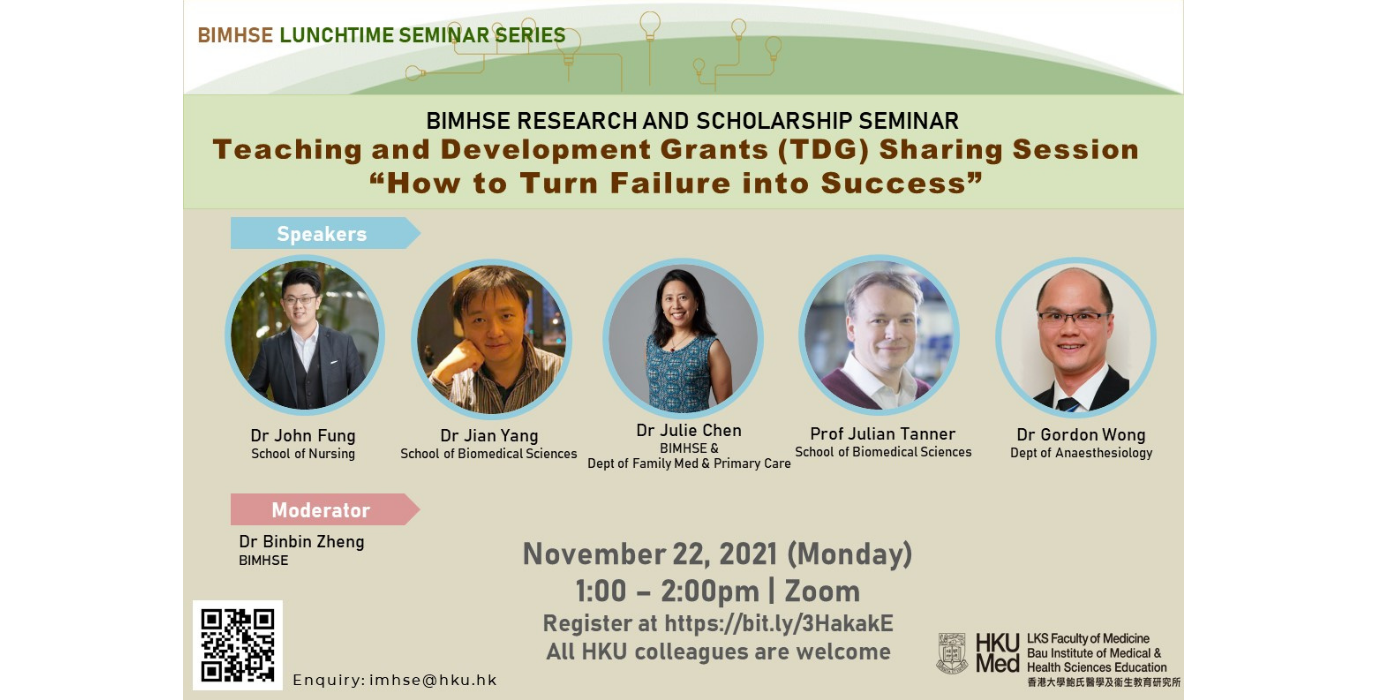 This seminar will provide insight into how failed TDG proposals eventually turn to successful ones through the sharing by Dr John Fung and Dr Jian Yang. Dr Julie Chen, Prof Julian Tanner and Dr Gordon Wong, members of the Faculty Teaching and Learning Quality Committee, will also discuss what is considered when recommending Faculty support for a project.