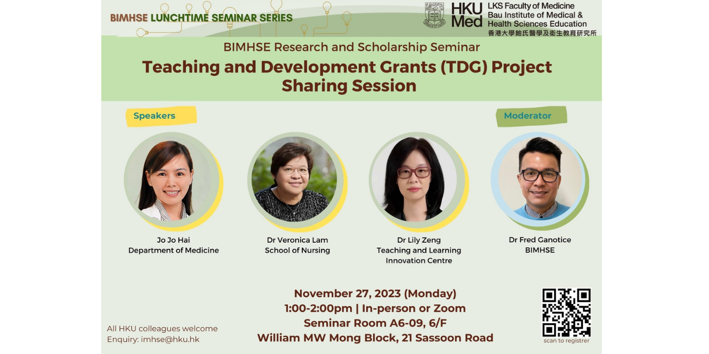 This seminar aims to help Faculty colleagues who are planning a TDG project or who are just interested in medical education research. It will help provide insight into the design and thinking behind successful HKUMed TDG projects through the sharing by the following speakers: