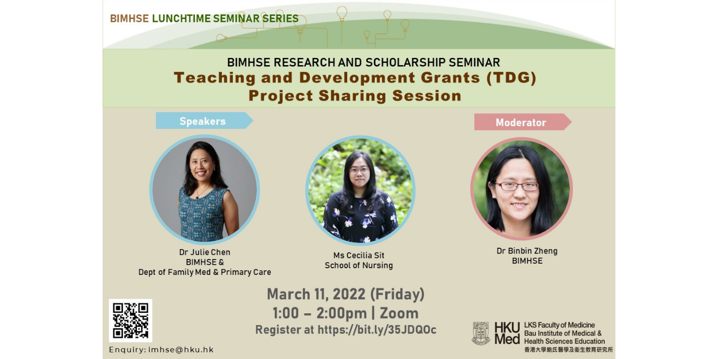 This seminar aims to help Faculty colleagues who are planning a TDG project or who are just interested in medical education research. It will help provide insight into the design and thinking behind successful HKUMed TDG projects through the sharing by Dr Julie Chen and Ms Cecilia Sit who have recently completed their TDG projects.