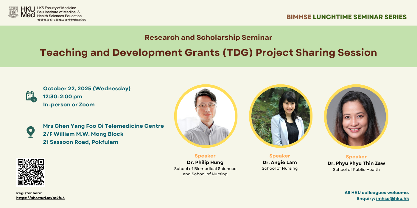 This seminar aims to help Faculty colleagues who are planning a TDG project or who are just interested in medical education research. It will help provide insight into the design and thinking behind successful HKUMed TDG projects through the sharing by the following speakers: