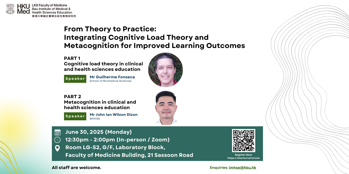 This part of the seminar provides an overview of metacognition – the awareness and regulation of one’s thinking processes – to clinical and health sciences teachers. Participants will discover how metacognitive strategies improve self-directed learning among students. The session presents classroom-ready techniques, including think-aloud protocols and reflection prompts, that help students identify knowledge gaps and regulate their learning. Participants will also gain practical approaches to foster reflective practitioners equipped for complex clinical environments, ultimately enhancing clinical and health sciences students’ learning through improved clinical reasoning and lifelong learning skills.