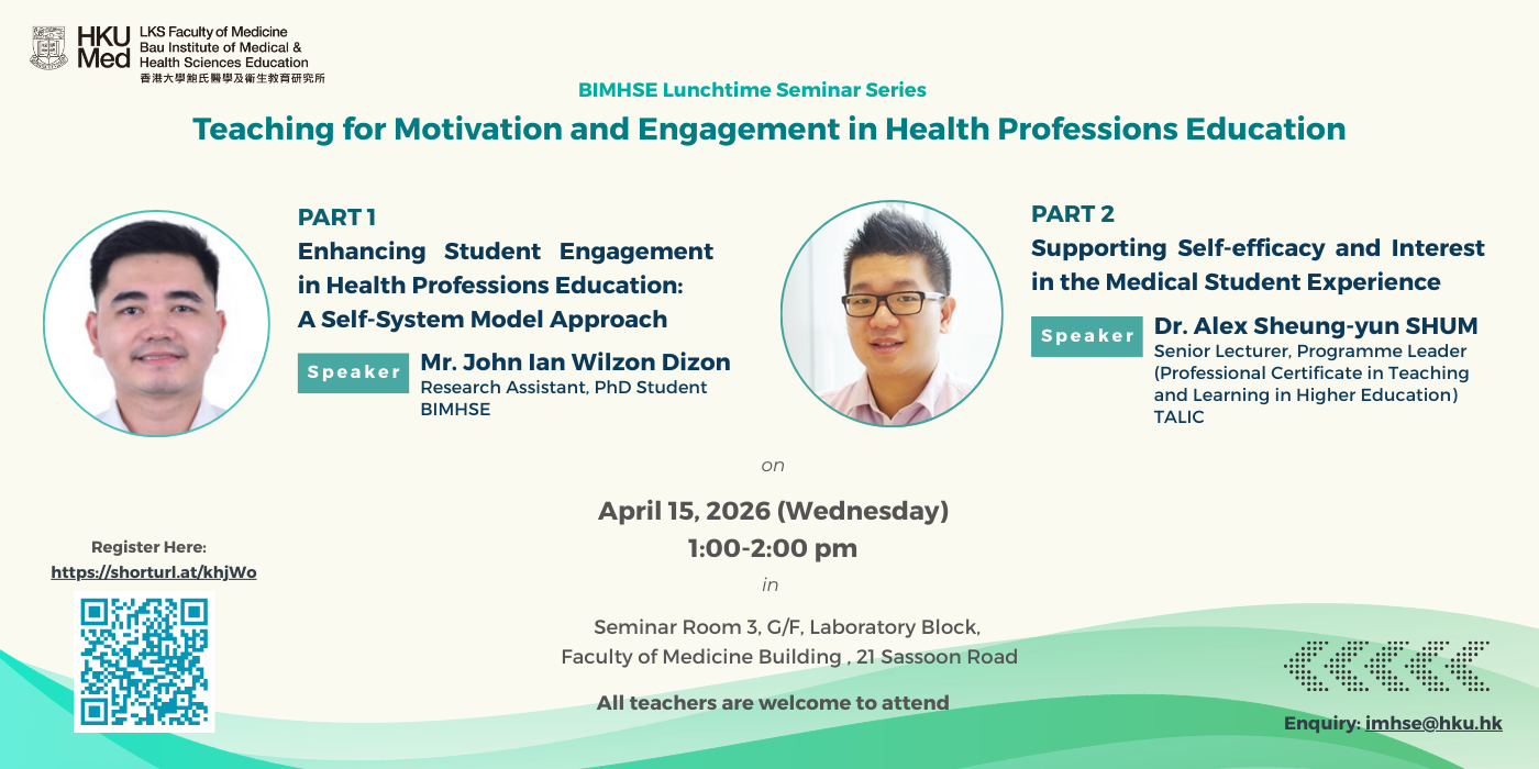 This two-part Lunchtime Seminar Series focuses on strengthening student motivation and engagement across health professions education. Grounded in theories from Educational Psychology and supported by empirical evidence, the series will help educators intentionally shape key motivational and engagement drivers that influence how students feel, think, and behave in their learning. Participants will be introduced to theoretical frameworks, guided to examine their own teaching contexts, and supported to design small, practical changes that can immediately enhance students’ motivation, engagement, and self-beliefs.